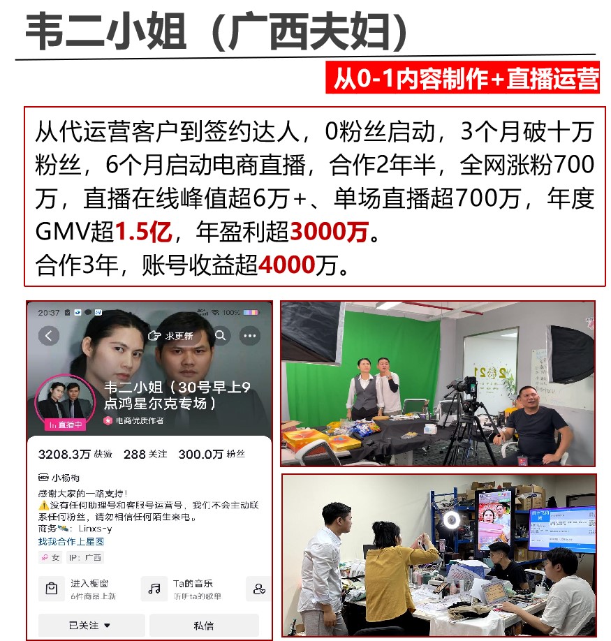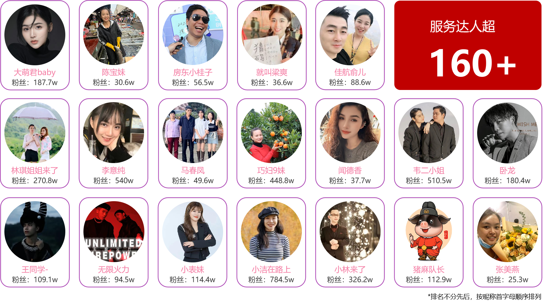 创易拥有多成功IP的打造经验,达人:李意纯、韦二小姐、小表妹、王同学、大萌君Baby、巧妇9妹、房东小桂子等;品牌:青秀山、园博园、三街两巷、涠洲岛、东风风行、五菱、三个椰子、五条友等区域知名品牌;政务:中国扶贫基金会、平安爱店(广西第一个百万政务号)、广西卫健委、玉林公安、博白禁毒等。